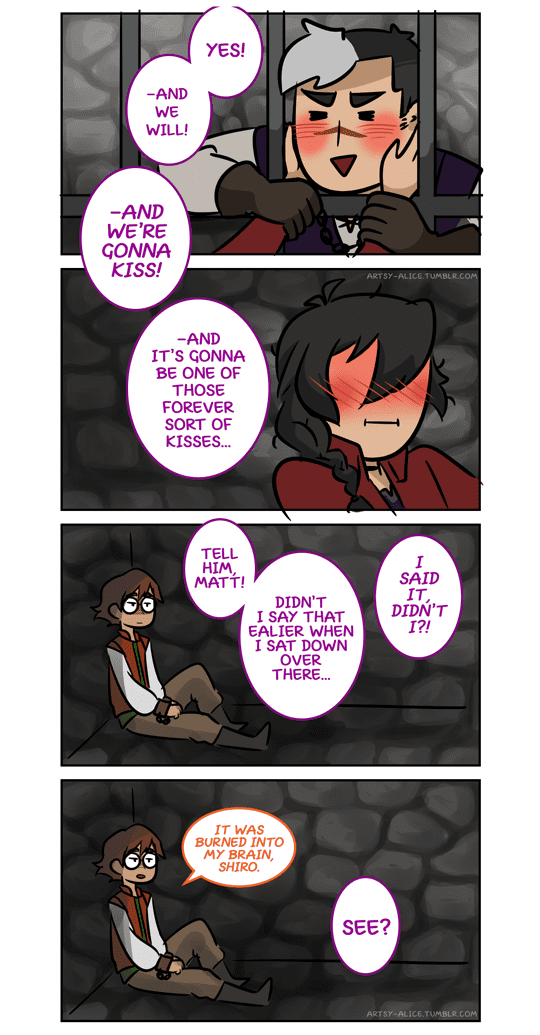 Prince Keith has found the hero who will aid him on his quest to save his kingdom, but he’s got his work cut out for him because Shiro the Hero… is a mess. (Then Keith says “King Lotor” and Shiro is READY TO GO.)